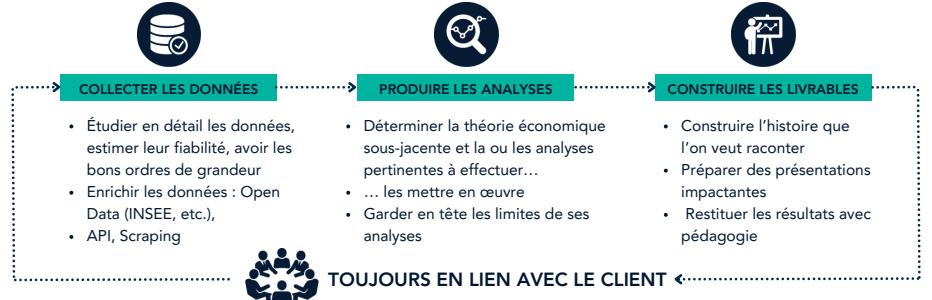 Si ta candidature est retenue, nous te contacterons pour te proposer un entretien, qui aura lieu de préférence dans notre bureau dans le 8ᵉ arrondissement de Paris. Dès le recrutement, tu seras invité à montrer ta façon de raisonner et à mobiliser tes compétences analytiques, mathématiques et statistiques sur de vrais sujets économiques. Cet échange d’une heure à une heure et demie sera l’occasion de répondre à tes questions, de revenir sur les temps fort de ton parcours et ta compréhension de notre environnement. Il comprendra une étude de cas t’invitant à mobiliser tes compétences pour répondre à des problématiques que nous rencontrons fréquemment dans le cadre de nos missions. Il contiendra également un test data te permettant de démontrer tes réflexes en termes de nettoyage de données.